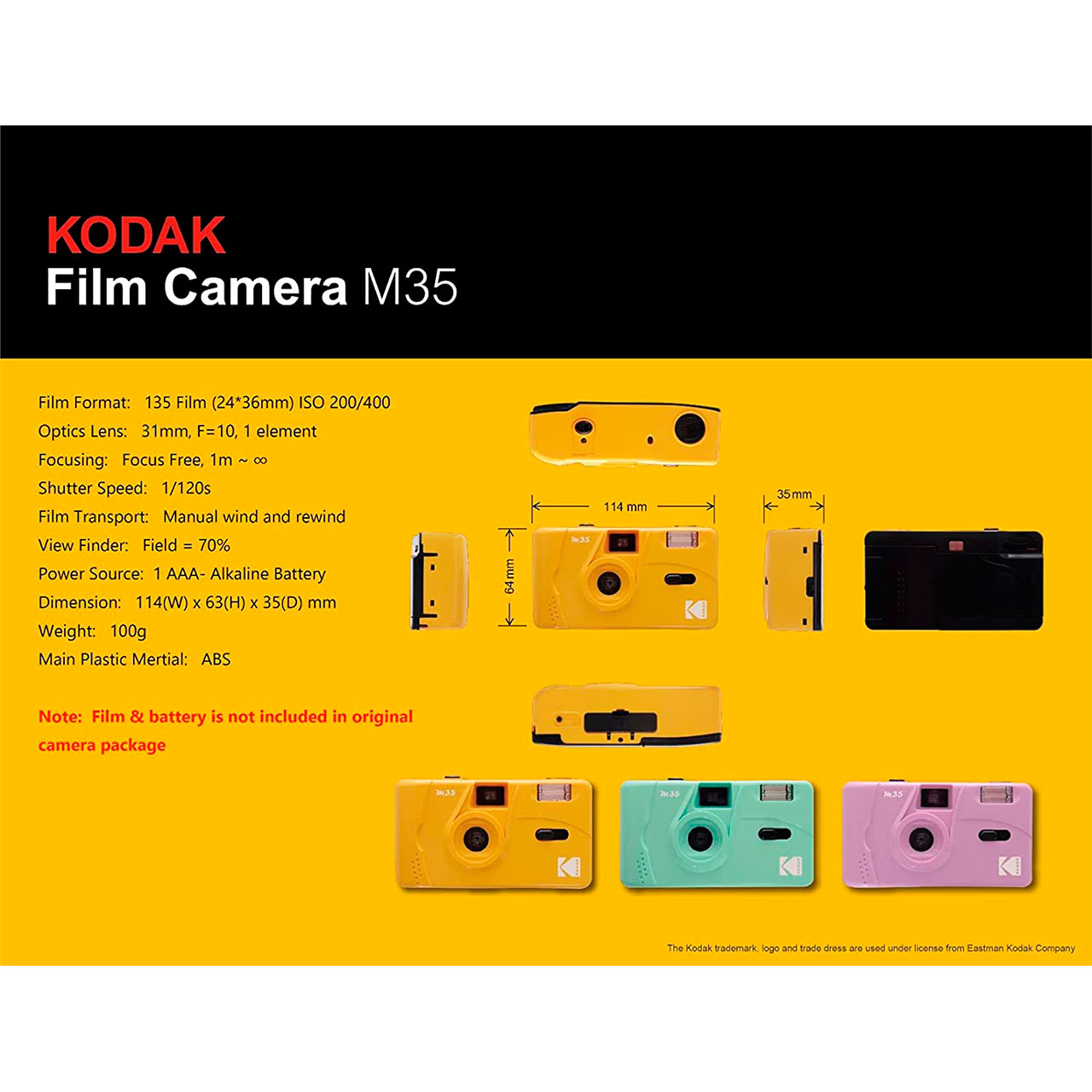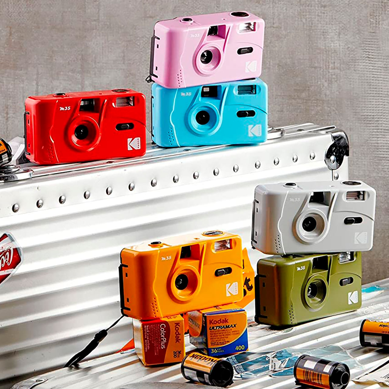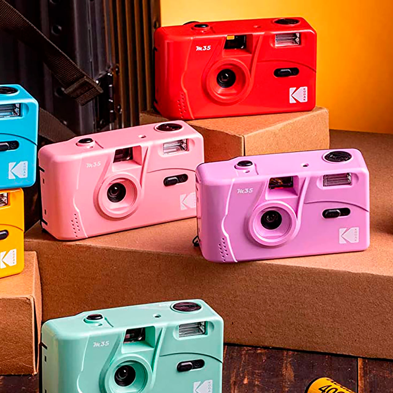 -Cámara de película reutilizable de 35 mm -Para películas en color y blanco y negro -Lente de ángulo ancho de enfoque fijo -Flash incorporado -Visor óptico -Acepta 1 batería AAA Kodak M35 Cámara Compacta Analógica 35 mm Verde | para película 35mm, Lente 31 mm f/10, ISO 200/400/800, Pila 1xAAA alcalina no incluido. Ofrecida aquí en verde menta, la cámara de película M35 de 35 mm con flash de Kodak es una cámara de película analógica fácil de usar. La cámara tiene un objetivo gran angular de enfoque fijo, perfecto para capturar la mayoría de las escenas de luz diurna bien enfocadas, y la cámara también cuenta con un flash incorporado para disparar por la noche. Compatible con negativo en color de 35 mm o película en blanco y negro, esta cámara de película reutilizable le permite capturar instantáneas en color o escenas en blanco y negro.