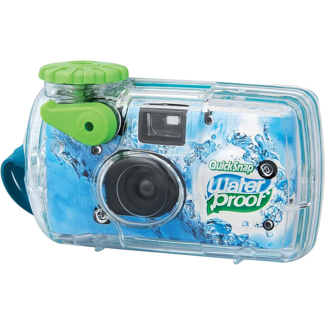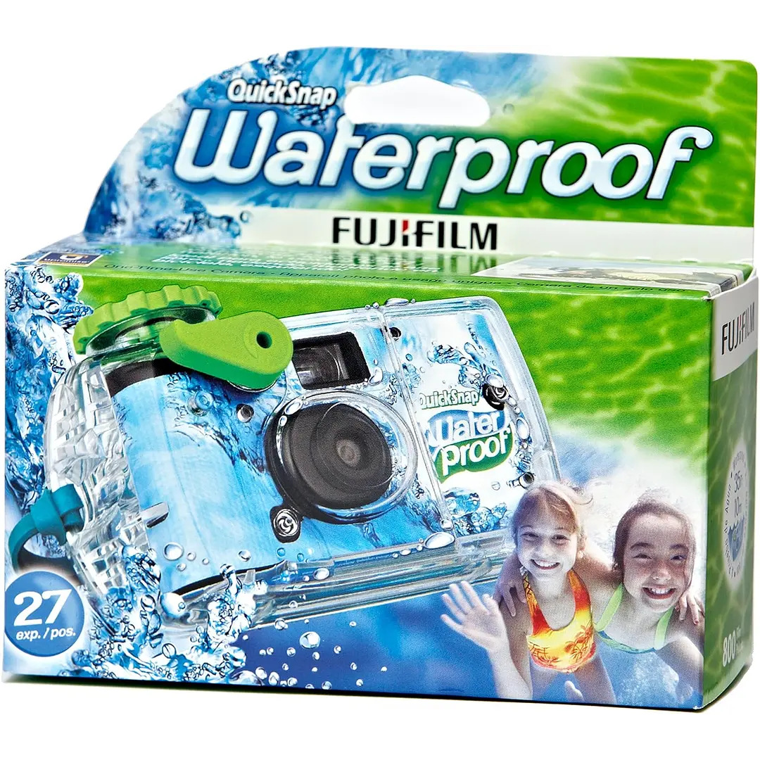Esta cámara para todo tipo de clima está lista para cualquier aventura. El disparador de palanca de gran tamaño en la parte frontal de la cámara y la perilla de avance de película montada en la parte superior hacen que sea muy fácil de operar. Es ideal para fotografiar al aire libre en condiciones húmedas y nevadas, ¡y funciona hasta 10 metros bajo el agua!. Cámara de un solo uso. Artículo Cámara desechable QuickSnap Waterproof 800 de 35 mm Película 800 ISO 35mm película (ISO 800/30°) 135 – 27 exp. – Lente 32 mm f/10, objetivo de enfoque fijo Velocidad de obturación 1/125 seg. – Condiciones de exposición Al aire libre en días soleados o ligeramente nublados. – Distancia entre el sujeto y el objetivo Al aire libre: más de 1 metro (luz diurna exterior brillante o nubladabrillante) Sumergido: Entre 1 a 3 metros (Exterior, luz diurna, agua clara) – Resistencia al agua (presión) Profundidad de hasta 10 metros Tamaño 73 (alto) x 133 (ancho) x 42 (profundidad) mm Peso 170 g