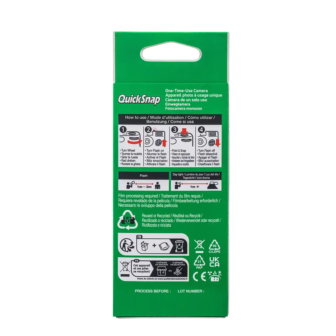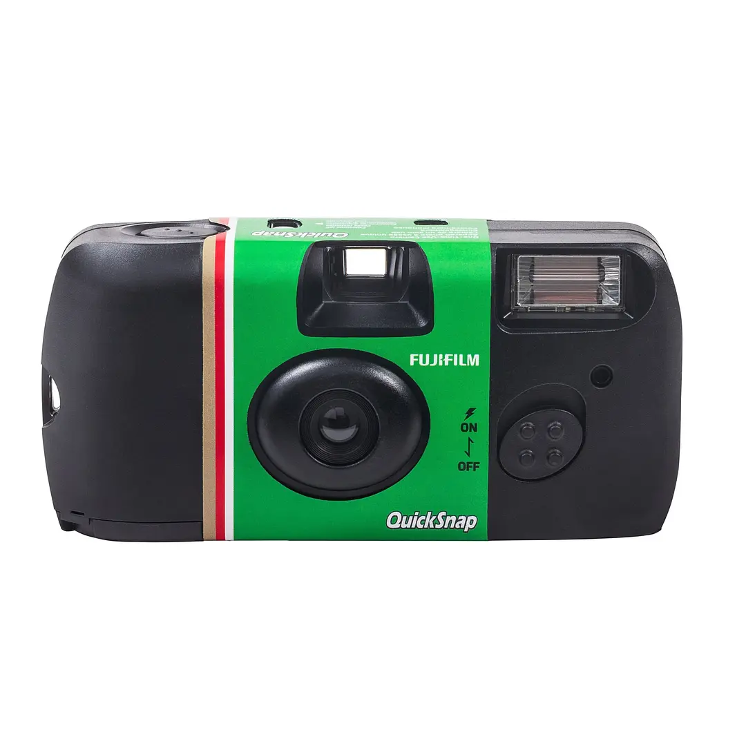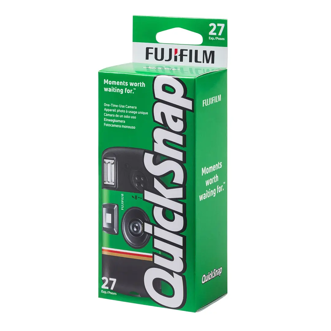 Diversión fotográfica para todos, en cualquier lugar y en cualquier momento. La cámara QuickSnap Flash 400 cuenta con un cuerpo compacto y viene precargada con película de Fujifilm 400 asas. Esta cámara de un solo uso produce imágenes muy nítidas y cuenta con un flash incorporado con un alcance de flash de 3 metros. La cámara QuickSnap Flash 400 es divertida y fácil de usar, y es ideal para tomar fotografías en interiores o exteriores. El interruptor de flash continuo facilita la toma de múltiples fotos, lo que le permite concentrarse por completo en las imágenes. Características técnicas – Artículo FUJIFILM QuickSnap FLASH 400 Película Fujifilm 400 (ISO 400/27°) 135 – 27 exp. – Número de exposiciones 27 Fotos Lente Lente 32 mm f/10, lente de enfoque fijo. – Velocidad de obturación 1/100 seg. – Condiciones de exposición Al aire libre en días soleados o ligeramente nublados. – Distancia entre el sujeto y el objetivo De 1m hasta el infinito – Flash electrónico incorporado (distancia efectiva entre el sujeto y el flash: 1 m – 3 m) – Dimensiones 115 (ancho) x 54 (alto) x 34 (profundidad) mm Peso 90g.