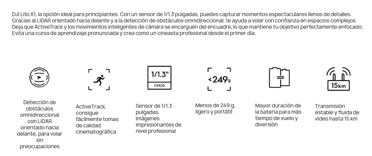 Incluye: DJI Lito X1, Control RC-N3, hub de carga, 3 baterías, bolso.
