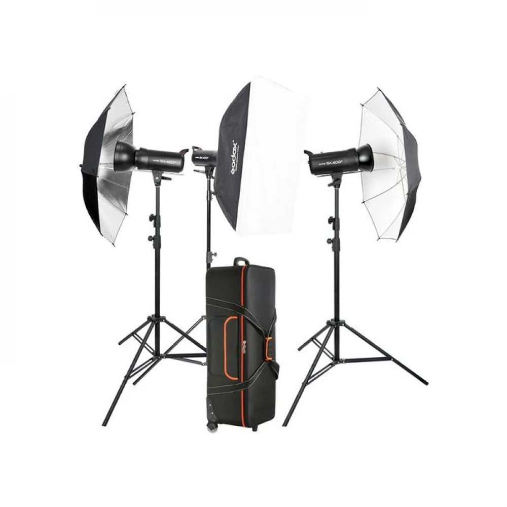 El kit de flash de estudio x SK400II fue preparado por Godox para los fotógrafos que necesitan llevar la iluminación de estudio en la carretera. El mismo incluye tres cabezales de flash SK400II, cada uno con pie de flash, un softbox, dos paraguas, un reflector estándar, un disparador inalámbrico XT16, y un estuche rígido para transportar con facilidad.
