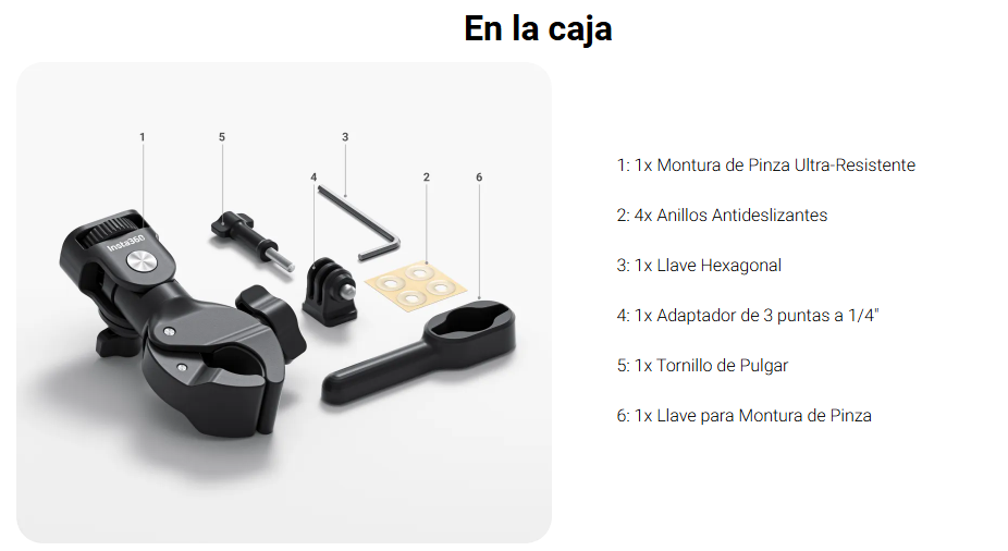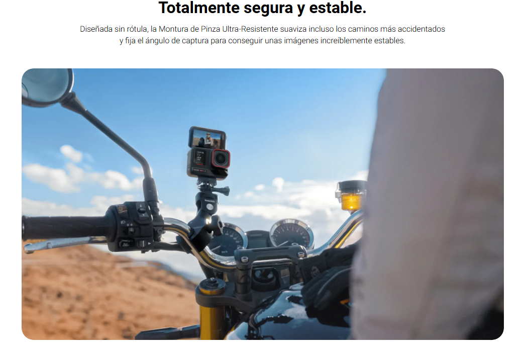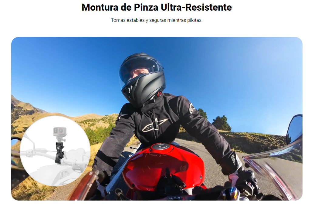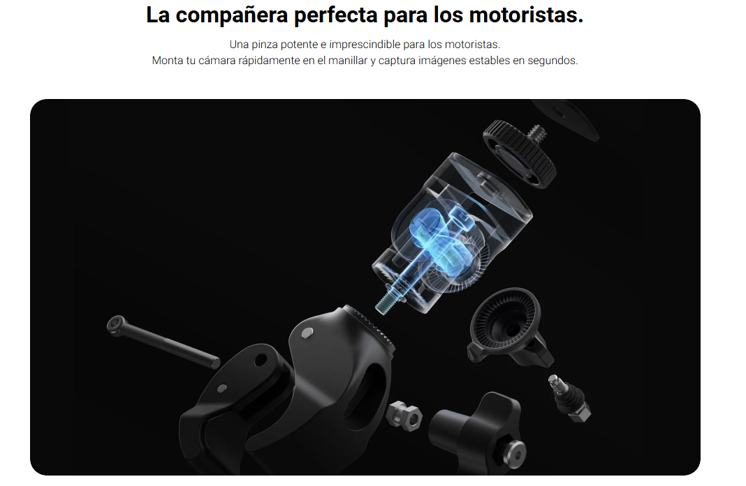 - Una potente pinza universal para fijar con seguridad tu cámara al manillar y mucho más.