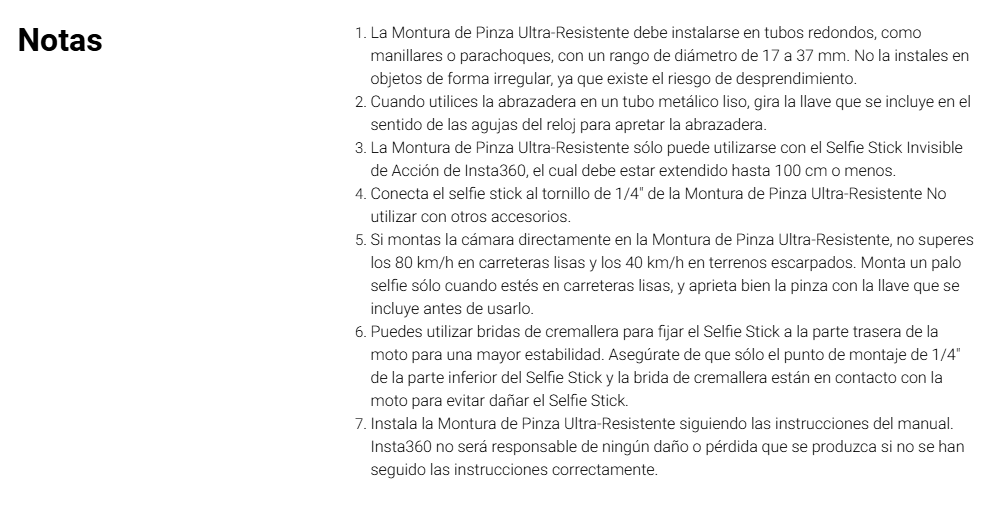 - Insta360 no ofrece asesoramiento legal. Los pilotos de motos deben consultar a profesionales para que les orienten sobre el uso en la carretera y las normas de tráfico. Sigue siempre las leyes y normativas locales cuando utilices los productos de Insta360. Insta360 no se hace responsable de los problemas legales que puedan surgir por el uso inadecuado de sus productos.
