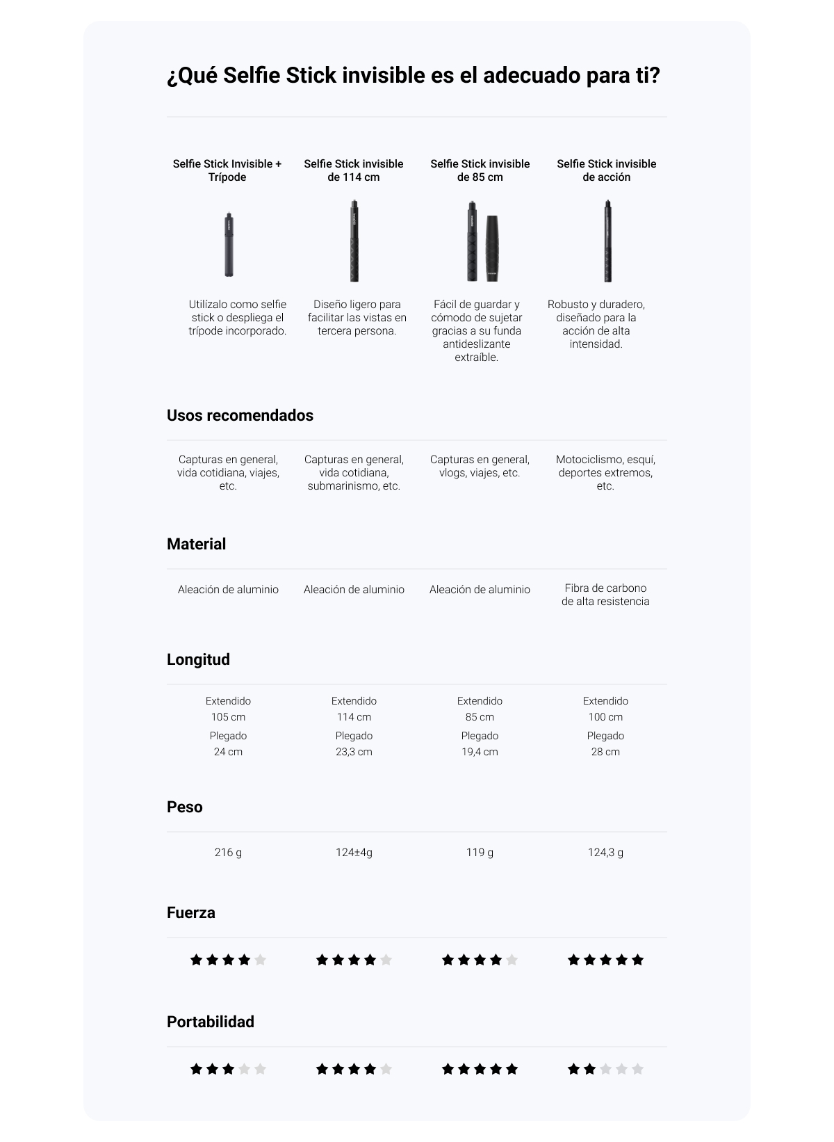 - Un selfie stick ligero y perfecto para capturar la vida diaria, pero no está diseñado para las aventuras a alta velocidad. Para deportes de alta intensidad y de acción, recomendamos el selfie stick invisible de acción.