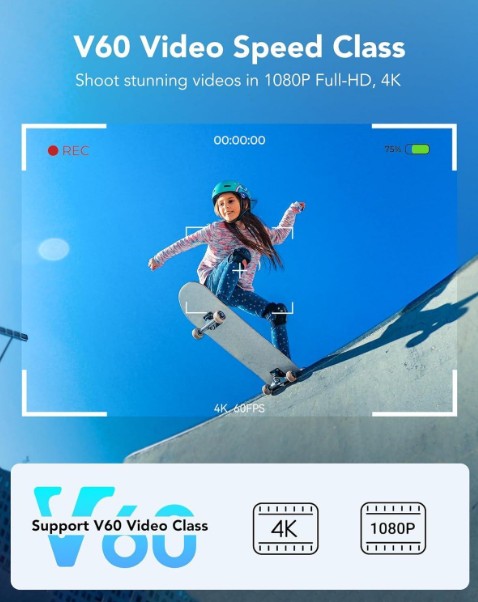 Su clasificación Class 10, U3 y V60 garantiza una escritura mínima sostenida de 60 MB/s, ideal para cámaras profesionales, mirrorless, DSLR, drones y videocámaras compatibles con SDXC UHS-II. Además, mantiene compatibilidad con equipos UHS-I, funcionando a la máxima velocidad soportada por el dispositivo.